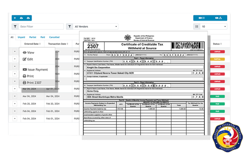 – 2307 (Certificate of Creditable Tax Withheld at Source).