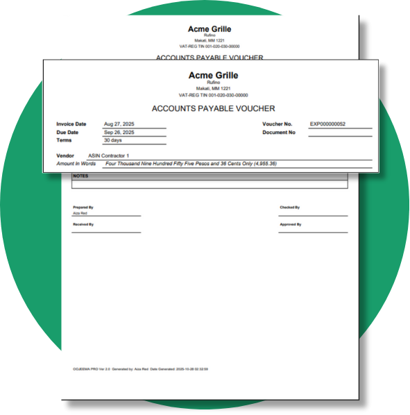 Oojeema lets you create bills in minutes, map VAT and withholding correctly, and see real-time payables and due dates at a glance—BIR-ready