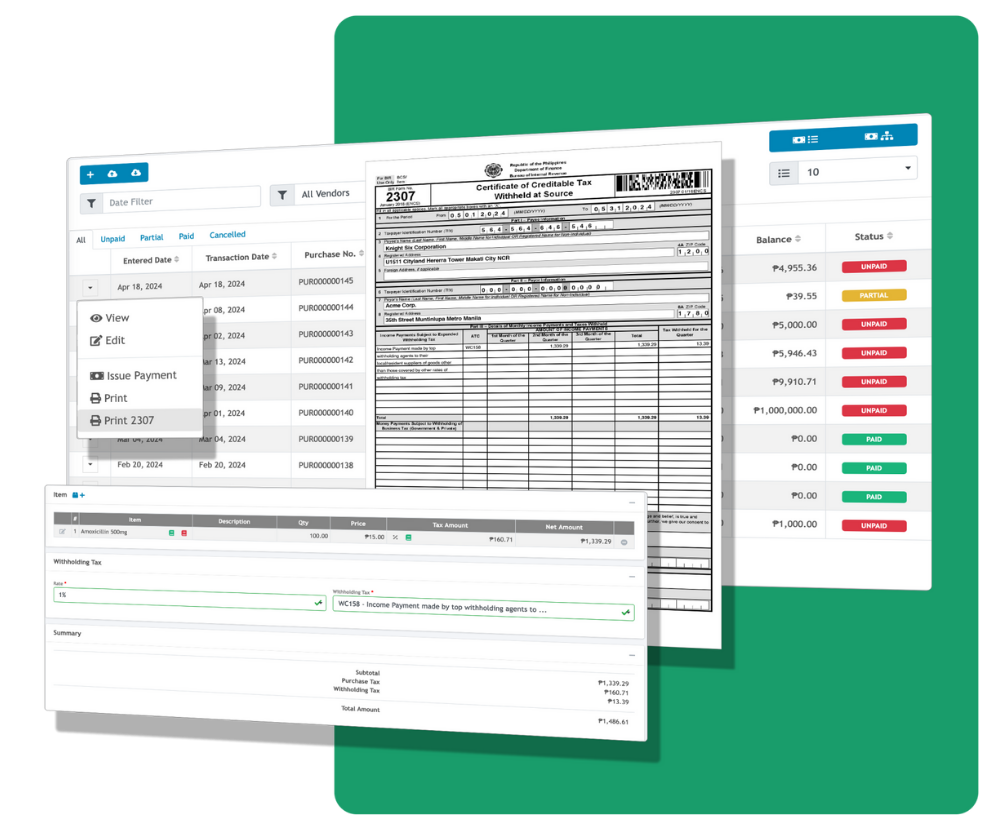 Generate vendor 2307s from your recorded purchases and expenses—with correct EWT details and ready-to-print PDFs.