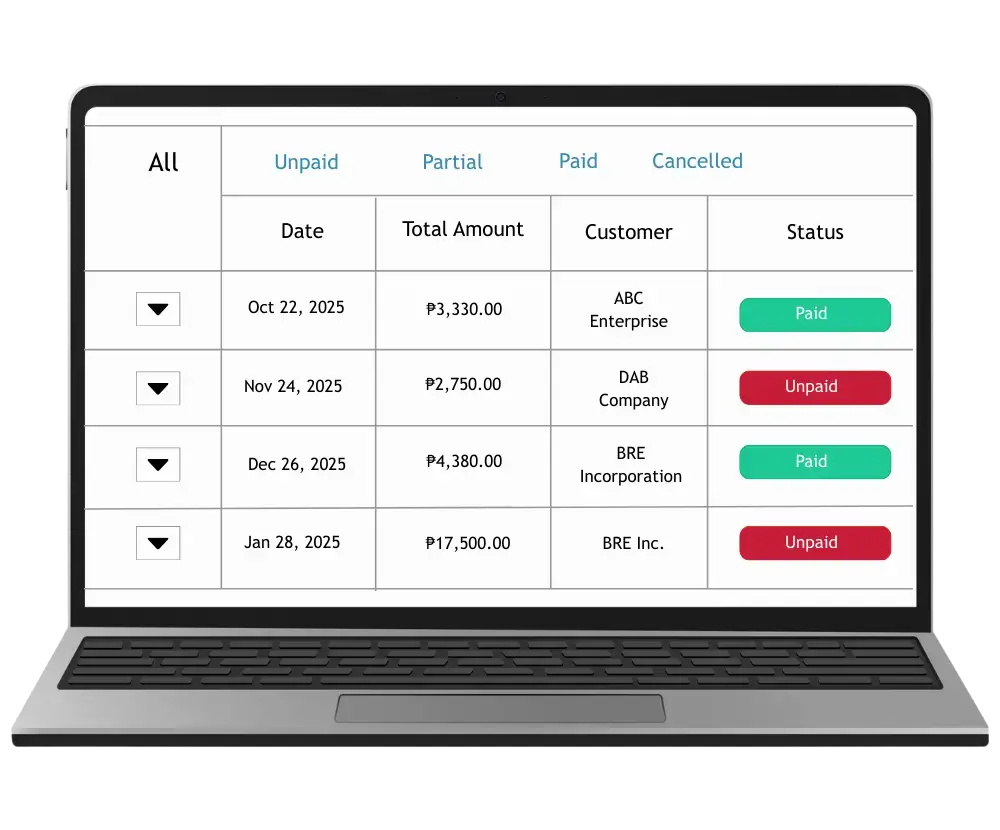 See what’s paid, unpaid, or cancelled—so you can follow up confidently and keep cash flowing.
