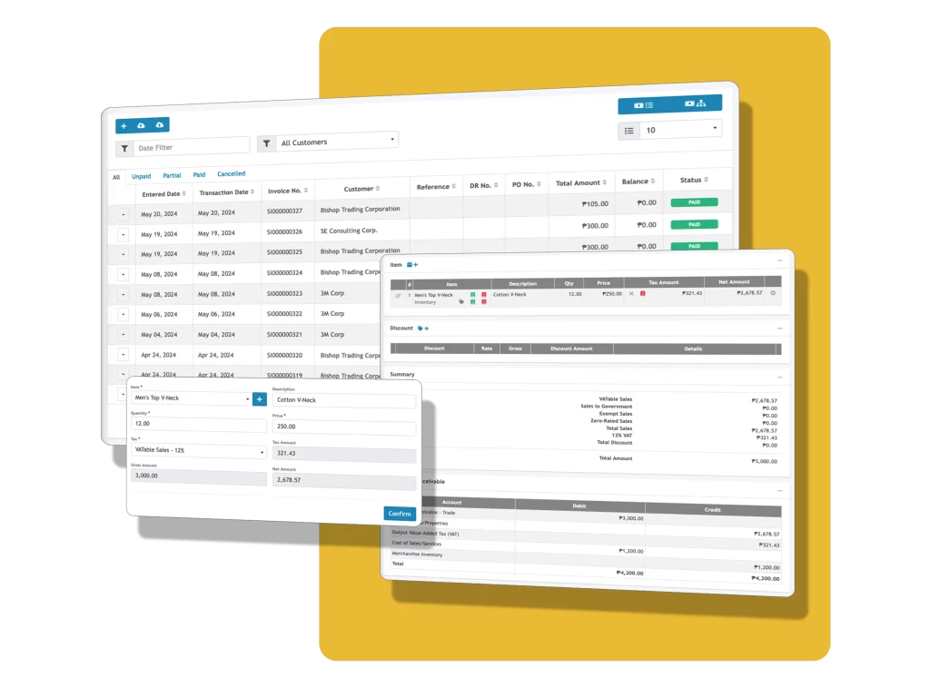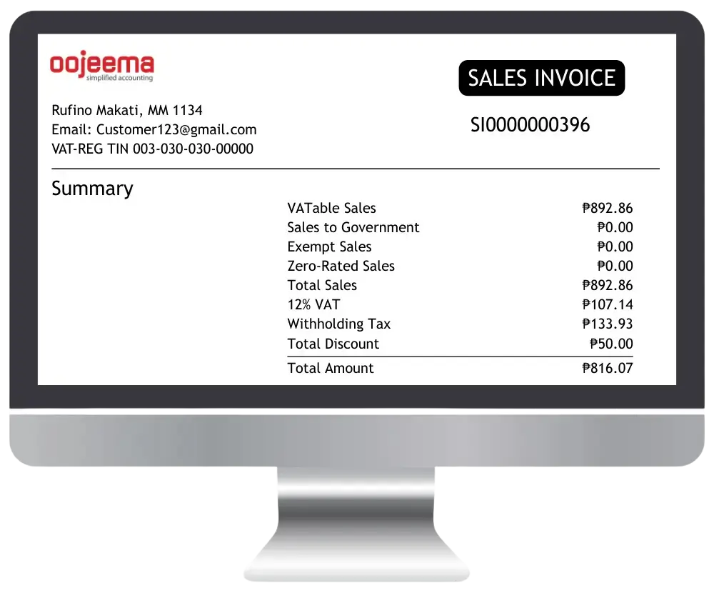Enter the invoice and Oojeema handles the numbers with correct VAT, CWT, and discounts every time.